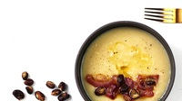 - Das Bohnen-Püree in einer flachen Schlüssel anrichten und die Zwiebeln mit Sauce darüber verteilen. Lauwarm servieren.